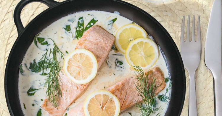 Leg de moten zalm op voorverwarmde borden, schenk de saus er rondom en garneer met wat bieslook.